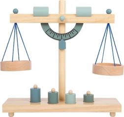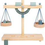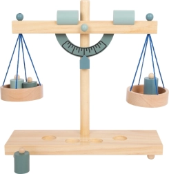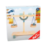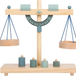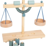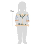 A gyerekek könnyen megértik a kiegyensúlyozás elvét a két serpenyőnek és a különböző tömegű, fa súlyoknak köszönhetően.