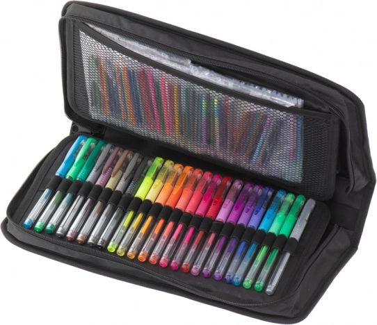 A nagy zseléstoll-készlet végtelen alkotási lehetőségeket kínál. A élénk, tartós színeknek köszönhetően jegyzetei és illusztrációi mindig látványosak és tiszták lesznek. A jól rendszerezett textil cipzáras tok mindent átláthatóan tart otthon, az iskolában és utazáskor is.