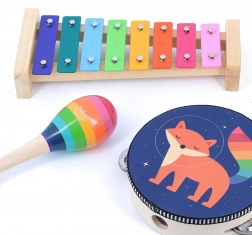 A készlet xilofont, tamburint, triangulumot és maracas-t tartalmaz, így kiváló oktatási eszköz a gyerekek zenei képességeinek és ritmusérzékének fejlesztéséhez.