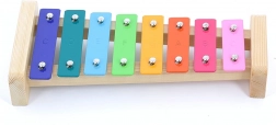 Szivárványszínű fém billentyűkkel ellátott xilofon fa talapzaton. Minden billentyűn hangjelölés található, ami megkönnyíti a zene tanulását.