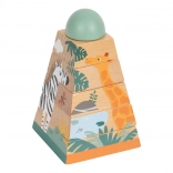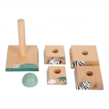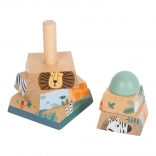 Ez a fa safari torony a gyermekek finom motorikus képességeinek és térbeli érzékelésének fejlesztésére lett tervezve. A színes blokkok rakosgatása közben a gyerekek barátságos afrikai állatokat fedezhetnek fel, mint például a zsiráf, zebra, koala és a oroszlán.