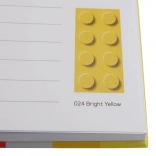 Minden vonalas oldalon egy LEGO elem látható egy konkrét árnyalatban, ami kellemesebbé teszi az írást és ösztönzi a kreativitást.
