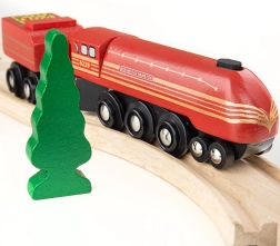 Ez a piros fa mozdony az ikonikus gőzszépség ihletésére készült, „Duchess of Hamilton” jelöléssel, és kész, hogy begördüljön gyermeke világának vágányaira. A szabványos mágneses kapcsolóknak köszönhetően könnyen csatlakoztatható más vagonokhoz és szerelvényekhez.
