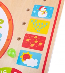 A tábla áttekinthető, nagy, mozgatható mutatókkal ellátott órát, valamint forgó és csúsztatható jelölőket tartalmaz a napokhoz, hónapokhoz, időjáráshoz és az évszakokhoz. Az alapvető feliratok angol nyelvűek, így a gyermek természetes módon nyelvi rálátást is szerez. A termék tartós, felelősen beszerzett fából készült, és alkalmas mindennapos otthoni és óvodai használatra.