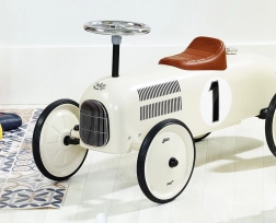 Stílusos gyerek futóbicikli versenyautós megjelenéssel, amely elbűvöl retro bájával és minőségi fém kivitelével. Kínál csendes haladást a gumírozott kerekeknek köszönhetően, könnyű kormányzást kormánnyal és masszív szerkezetet 20 kg teherbírással – ideális kis versenyzőknek 1,5 éves kortól.
