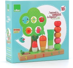 Ez a minőségi fa játék egyesíti a szórakozást és a tanulást. A gyerekek répát, póréhagymát, paradicsomot és más formákat fűznek és raknak az 1–5-ig számozott tüskékre, így természetes módon sajátítják el a számolást, valamint a színek és méretek szerinti válogatást. A készlet része egy kis fa is csúszó elemekkel a felfedezéshez és a szem–kéz koordináció gyakorlásához.