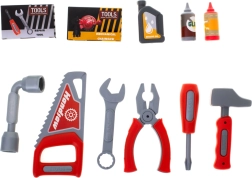 A csomagban csavarok, anyák, szegek, fűrész, kulcsok, csavarhúzó, kalapács, fogó és összekötő elemek találhatók – minden a valósághű és kreatív játékhoz.