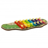A xilofon fa és fém kombinációjából készült. Elég finoman megütni az ütővel a lapot, és tiszta hang szólal meg, amelynek hangerőssége az ütés erejétől függ. A élénk, meleg színek játékra csábítanak, és remekek a színek tanulásához is.