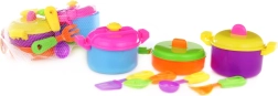 Szórakoztató gyermek edénykészlet praktikus hálóban 3 éves kortól kis szakácsoknak. Tartalmaz 2 fazekat fedővel, serpenyőt fedővel és 4 darab konyhai eszközt, ideális főzőcskézéshez és a fantázia fejlesztéséhez.