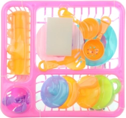 A készlet tartalmaz 4 csészét, 2 kistányért, egy fazekat, egy serpenyőt, 2 fedőt, csepegtetőt, szivacsot és további kiegészítőket – minden készen áll a végtelen szórakozásra a gyerekkonyhában. Remek a képzelet, a finommotorika és a szociális készségek fejlesztéséhez.