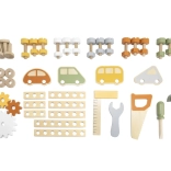 - Munkapad, szerszámok, csavarok és anyák, fa lemezek, fogaskerekek, autócska, mutatós óra