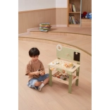 Stílusos gyerek munkapad természetes–zöld színösszeállításban, amely valósághű műhelyélményt nyújt biztonságos, fából készült formában. A gyerekek csavarozhatnak, kereket cserélhetnek az autócskán, „vághatnak” elemeket, összeállíthatják a fogaskerekeket, és felfedezhetik az ok-okozati összefüggéseket. Az áttekinthető tárolómegoldásnak köszönhetően minden alkatrész és szerszám mindig kéznél van.