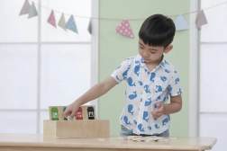 A játék játékos fa lapocskákkal és színkódolt kukákkal tanítja meg a gyerekeknek a helyes szelektálást.