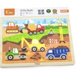 Az építős témájú fa puzzle élénk színeivel és robusztus kivitelével hódít, és bírja a mindennapos játékot. A 24 darabos készlet remek választás az első „nagyobb” kirakóhoz, támogatja a koncentrációt és a vizuális észlelést.