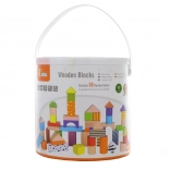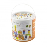 Ez a sokoldalú fa építőkocka-készlet végtelen lehetőséget kínál tornyok, hidak és házikók építésére. Az elemek kellemes tapintásúak, sima élekkel rendelkeznek, és színes lakkozást kaptak a vonzó és biztonságos játékért. A praktikus fogantyús vödör megkönnyíti a tárolást és a hordozást.