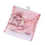 A szett Spanyolországban kézzel készül, a minőségre és a részletekre helyezett hangsúllyal. Tartozik hozzá egy praktikus tépőzáras hordtáska, amelyben a ruhácskákat könnyen elteheti vagy magával viheti útra; a csomagot egy műanyag vállfa egészíti ki az áttekinthető tároláshoz.