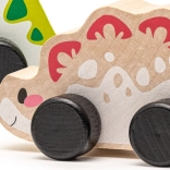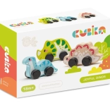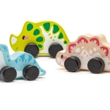 A készlet három kerekekkel ellátott fa dinoszauruszt tartalmaz a könnyű mozgásért, ideális a legkisebbek számára.