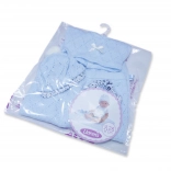 A 26 cm-es újszülött baba ruha tartalmaz egy pulóvert, egy sapkát és egy bugyit. Úgy tervezték, hogy maximális kényelmet és eleganciát biztosítson a babával való játék során. A csomagolás egy finoman kötött takarót is tartalmaz, amely kiegészíti az összképet. Ez a készlet átlátszó csomagolásban van műanyag vagy karton vállfával.