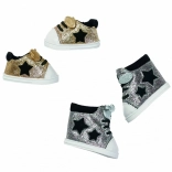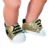 Varázsold ragyogóvá minden lépését a BABY BORN arany színű, divatos tornacipőivel. A fényes, glitteres felület, a kontrasztos részletek és a puha talp kényelmes viseletet biztosítanak még hosszabb játékos kalandok során is. Remek kiegészítő minden kis stylist számára, akik babájuknak stílust, csillogást és egyediséget szeretnének adni.
