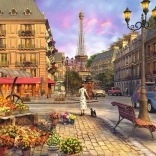 A jelenet élénk utcai hangulatot ábrázol virágárusokkal és klasszikus építészettel, amely kiemeli a részletgazdagságot és élettartamot.