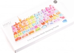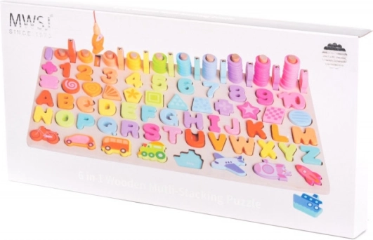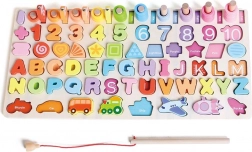 Ez a fa készlet sok érdekes elemet tartalmaz, beleértve a halacskákat, színes karikákat, betűket és számjegyeket 1-től 10-ig, beleértve a mágneses horgászbotot is. Segítségével a gyerekek megtanulják felismerni a formákat és a színeket, ami kiváló eszközzé teszi a tanuláshoz. Az elemek javítják a finom motoros készségeket és fejlesztik a szem-kéz koordinációt.