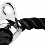 A kötél gumírozott, csúszásmentes végekkel van felszerelve a biztonságos fogás érdekében az edzések során. A fém csatlakozó könnyű csatlakozást tesz lehetővé bármilyen edzőgépre, legyen az felső vagy alsó emelő.