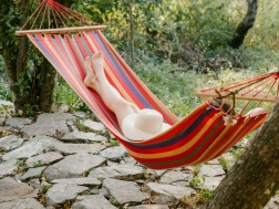 Ez a kényelmes függőágy fa merevítőrudakkal folyamatosan nyitva tartja a fekvőfelületet, így a be- és kiszállás egyszerű. A vastag pamut poliészter keverékkel készült erős szövet tartós, légáteresztő és kellemes a mindennapi pihenéshez. 150 kg teherbírásának köszönhetően biztos tartást és stabilitást nyújt kültéren és beltéren egyaránt.