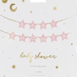 Stílusos banner Baby Shower felirattal, finom világos rózsaszín árnyalatban, amely szépen kiegészíti a babaváró ünnepség dekorációját. A csillag alakú díszek gyengéd hangulatot adnak a térnek, és kb. 3 m hosszának köszönhetően remekül mutat a desszertasztal fölött, a fotósaroknál vagy a bejáratnál.
