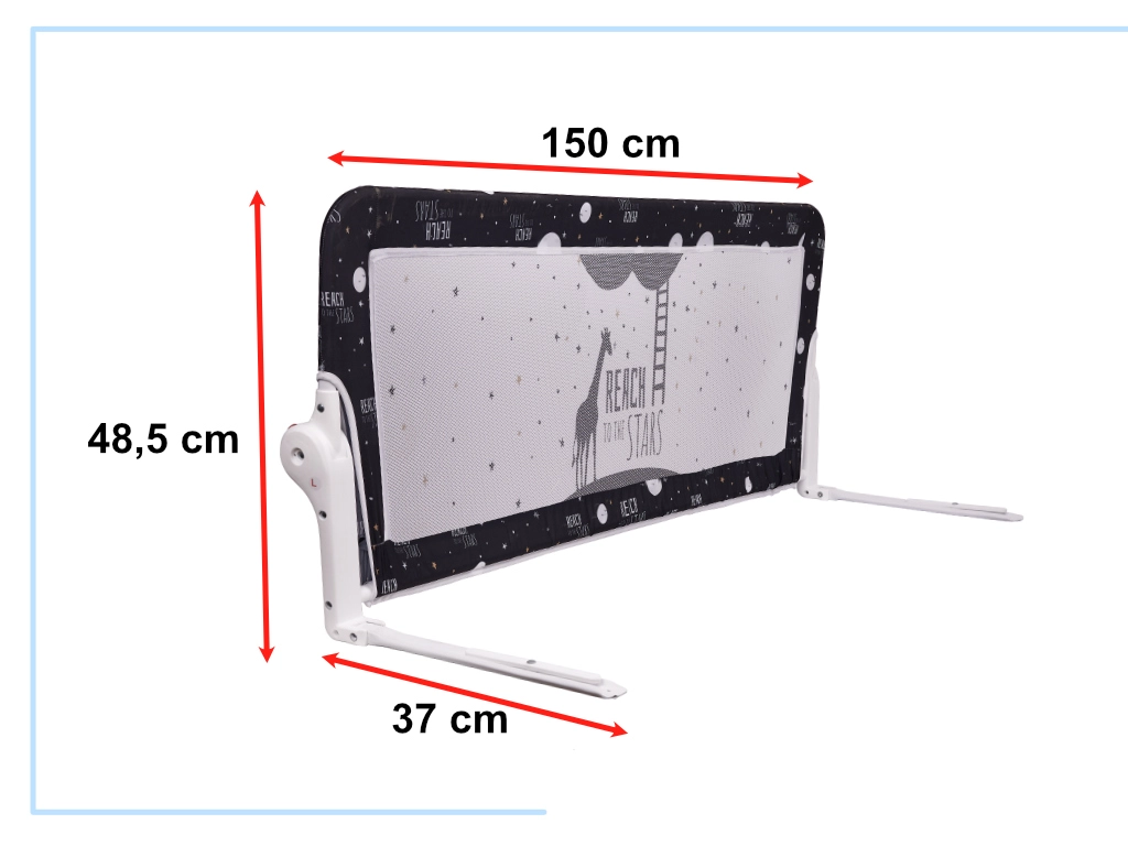 Praktikus, 150 cm hosszú gyermek ágyrács lehajtható mechanizmussal, amely megakadályozza, hogy a gyermek éjszaka leguruljon az ágyról. A masszív fémváz, az erős műanyag csatlakozók és a légáteresztő háló megbízható védelmet, fúrás nélküli, egyszerű szerelést és kényelmes lehajtást biztosít egyetlen gombnyomással.