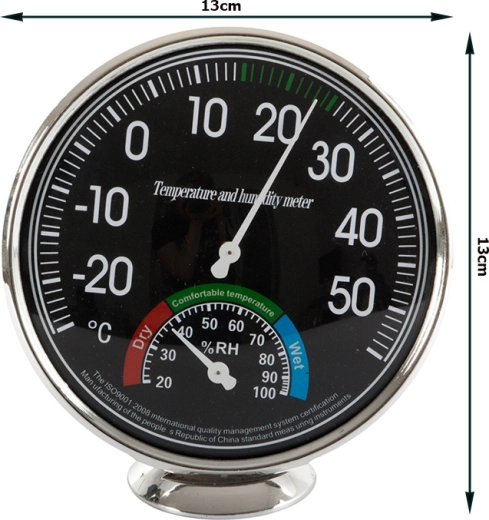 - Ellátva két nagy számlappal - 11 cm átmérőjű hőmérséklet- és 4 cm nedvességmérő.