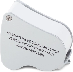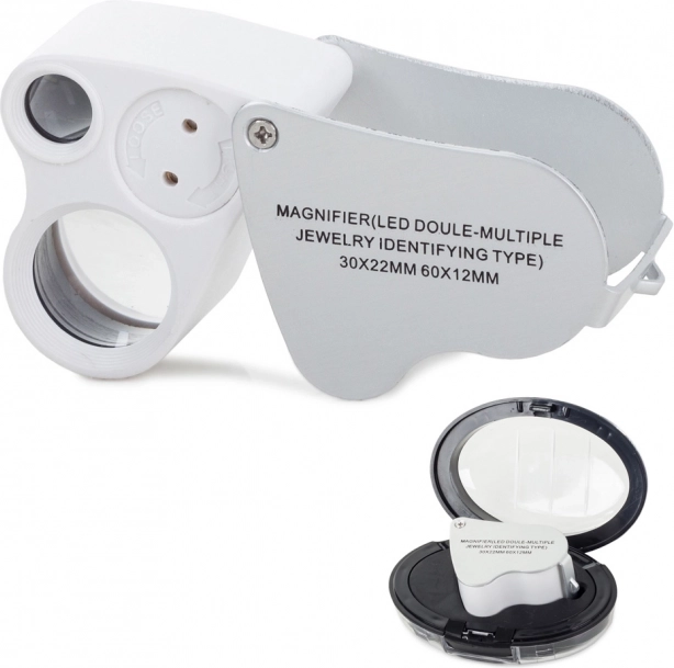 Praktikus zsebméretű nagyító 30× és 60× nagyítással, valamint két erős LED-diódával a tiszta képért. Ideális ékszerekhez, bélyegekhez, érmékhez és elektronikához. Kompakt, összecsukható kialakítás tartós alumínium burkolattal és kényelmes kapcsolóval a könnyű használatért otthon és útközben is.