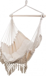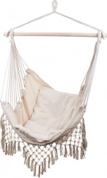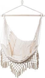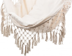 A macramé szegély és a dekoratív bojtok kiemelik a boho megjelenést, amely remekül illik növényekhez és természetes kiegészítőkhöz. A egypontos felfüggesztésnek köszönhetően a széket könnyen rögzítheti mennyezeti kampóra vagy állványra. A csomag 2 puha párnát tartalmaz a még nagyobb kényelemért olvasás és pihenés közben.