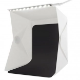 Kompakt, árnyékmentes fotósátor 20 LED szalaggal termékfotózáshoz, amely lágy, egyenletes fényt biztosít visszatükröződések nélkül. USB-táplálás, gyors összeállítás mágnesekkel, a csomagban fehér és fekete háttér, valamint praktikus tok a könnyű hordozáshoz.
