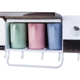 Tartsa fürdőszobáját tökéletesen rendezett állapotban ezzel a falra szerelhető fogkefe- és pohártartóval, beépített fogkrémadagolóval. Kínál praktikus rekeszeket kozmetikumoknak, 3 darab, 300 ml-es poharat, fogkeféknek horgokat és egyszerű fali rögzítést tapadókoronggal. A stabil kialakítás akár 5 kg teherbírással és az integrált törölközőtartóval rendet és helytakarékosságot biztosít.