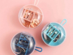 A kivehető középső rendezőnek köszönhetően a rekeszek egy része önállóan is használható. A kompakt méret, átmérő 9 cm és magasság 6 cm, ideálissá teszi kézitáskába, bőröndbe vagy a pipereasztalra. Elérhető színek: rózsaszín, sötétkék, zöld.
