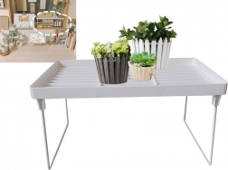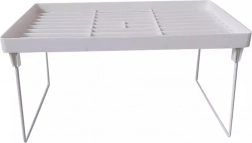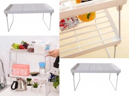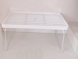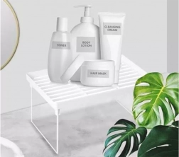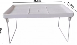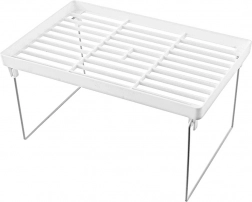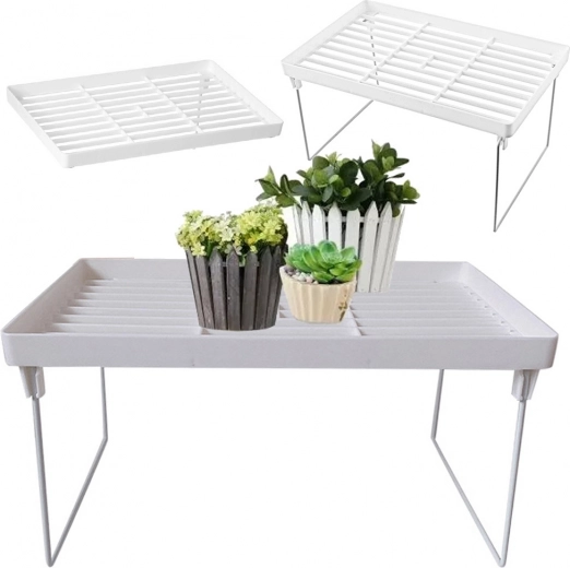 Pratico organizer modulare a ripiani che aiuta ad aumentare lo spazio di archiviazione sul piano cucina, in bagno e nei pensili. Struttura leggera ma stabile che combina superficie d’appoggio in plastica e gambe in metallo, facili da piegare e adattare. Grazie al piano a griglia è adatto anche come portascolapiatti per stoviglie o vasi, mantenendo tutto ordinato e ben organizzato.