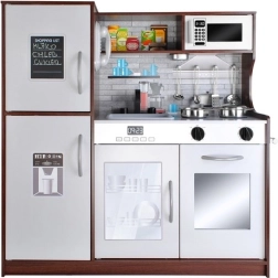Inclusi pentolame e utensili in metallo: pentola, padella, coperchio e 4 cucchiai da cucina (mestolo, cucchiaio per spaghetti, schiumarola, mestolo per pasta). Il lavello estraibile permette di “lavare” le stoviglie dopo il gioco. Il design senza tempo nella combinazione marrone scuro e bianco si adatta a qualsiasi cameretta.