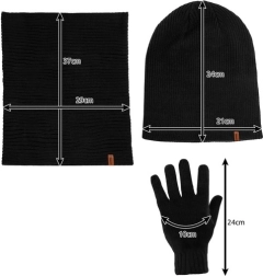 Il completo include un cappello nero, una sciarpa e guanti, tutto realizzato in acrilico, ideale per il periodo invernale.