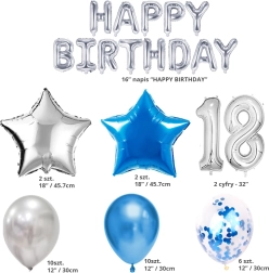 Festeggia il 18º compleanno con un set di palloncini che aggiunge un'atmosfera unica e rende la tua festa indimenticabile. Con i palloncini nella combinazione argento e blu creerai un bellissimo sfondo per foto memorabili.