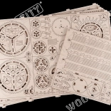 Il modello è realizzato in materiale naturale, un compensato di betulla di alta qualità. Il principale vantaggio è l’assemblaggio senza l’uso di colla o attrezzi. L’orologio è funzionante dopo la carica e offre un piacevole ticchettio fino a 12 ore.