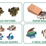 Include pezzi sagomati come animali, edifici e oggetti che aggiungono divertimento e un grado di difficoltà maggiore al montaggio.