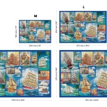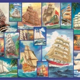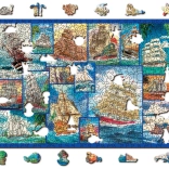 Possibilità di montare il puzzle sia in base all'immagine che alla forma, con un tema di velieri su un lato e un motivo ricorrente sull'altro.