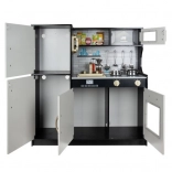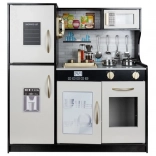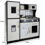L’elegante cucina XL in legno di KRUZZEL, in nero, bianco e oro, offre ai bambini un gioco di cucina realistico. Include illuminazione LED, effetti sonori dei bruciatori, elementi interattivi e un ricco set di accessori incluso (pentola, padella, coperchio, 4 utensili). Lavello estraibile, forno, microonde e armadietti a “clic” stimolano creatività, apprendimento attraverso il gioco e role play.
