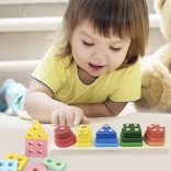 Infilare i pezzi attraverso gli ostacoli sui pioli richiede una manipolazione precisa delle forme – così si rafforzano le dita, la concentrazione e la coordinazione occhio–mano.
