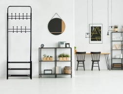 Nella parte inferiore dell'appendiabiti troverai tre ripiani funzionali dove puoi riporre piccoli capi di abbigliamento, borse e persino scarpe. La struttura stabile con 4 piedi assicura stabilità anche sotto carichi maggiori.