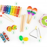 Il set include strumenti a percussione molto amati – dal tamburello e triangolo alle maracas e ai piattini – grazie ai quali il bambino sviluppa coordinazione occhio-mano, concentrazione e creatività. La lavorazione sicura senza spigoli vivi e i materiali resistenti garantiscono una lunga durata.