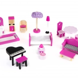 Questa casetta include 17 pezzi di mobili in legno, come tavolo con sedie, sofà, tavolino da caffè, fornello con sportelli apribili, vasca da bagno, WC, lavandino con specchio, pianoforte con sgabello, letto, comodino e pouf, e tre lampade da terra, permettendo scenari di gioco senza limiti.
