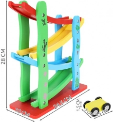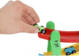 La pista da corsa in legno per auto non è solo un passatempo divertente, ma anche uno strumento educativo. Ci sono 4 livelli distinti per colore, che supportano il riconoscimento dei colori. Grazie alla sua costruzione, permette una discesa fluida delle macchinine, utile per osservare le relazioni causali.