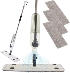 Il mop viene fornito con 3 panni in microfibra, offrendo convenienza grazie al pulsante dello spruzzatore integrato nel manico. È adatto a tutte le superfici e permette una pulizia perfetta senza la necessità di un secchio.