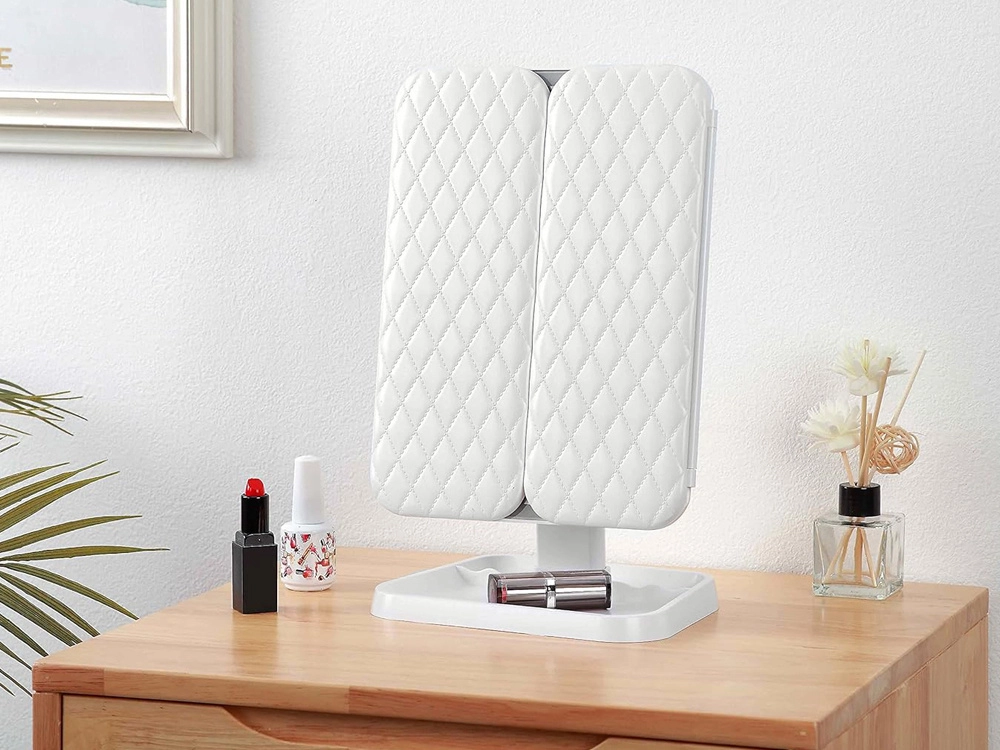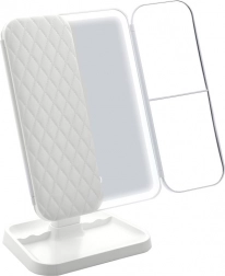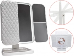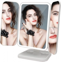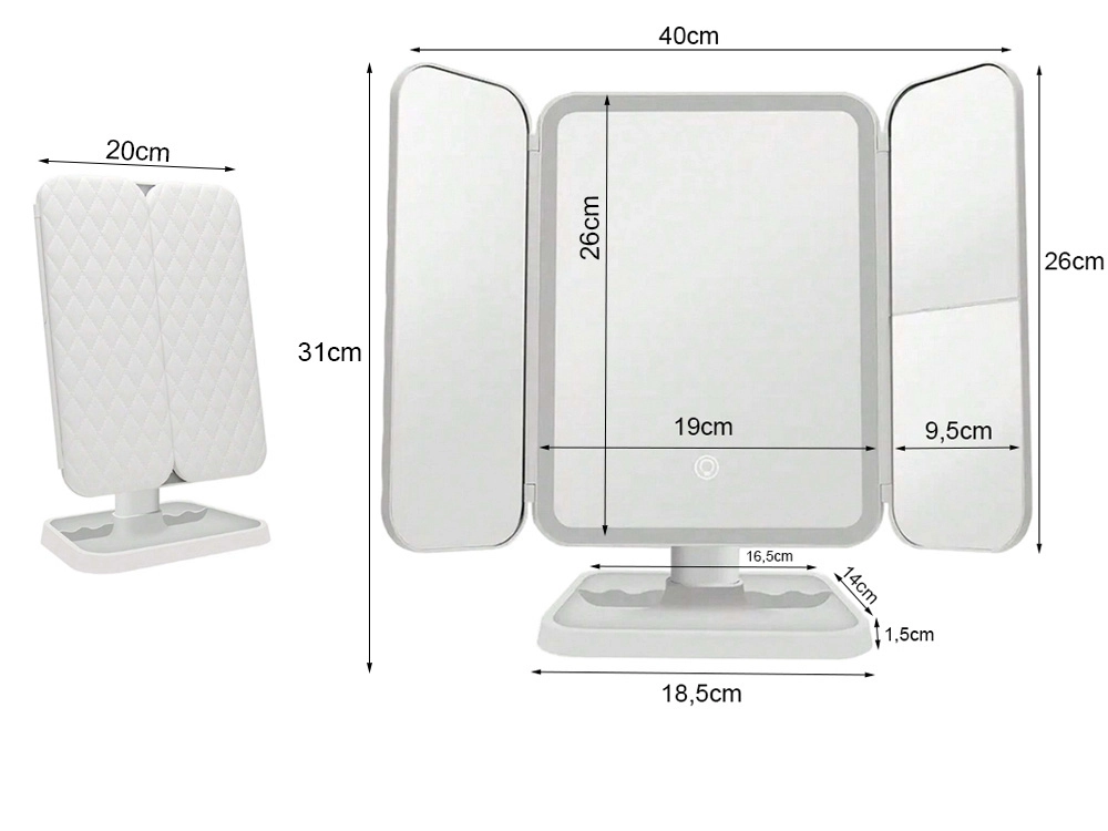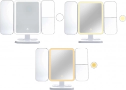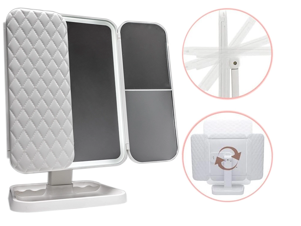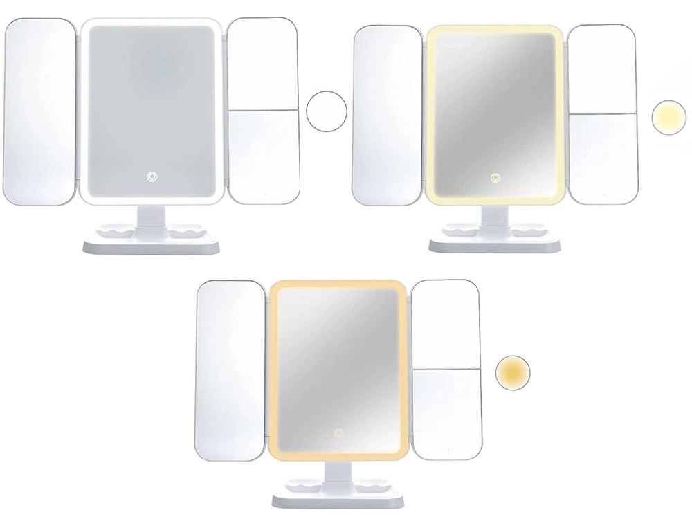 Elegante specchio da tavolo per il make-up con triplo pannello e illuminazione LED integrata per un trucco e una cura della pelle impeccabili. Offre 3 temperature di colore (fredda, calda, neutra), dimming continuo tramite interruttore touch e specchi laterali ingrandenti 2× e 3× per dettagli di precisione. Comoda ricarica via USB e batteria integrata per un utilizzo senza cavi. Design raffinato con sportelli pieghevoli protettivi e base stabile.
